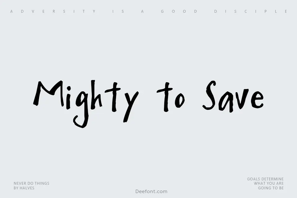 Mighty to Save is a bold, textured handwritten font designed by Kimberly Geswein. Inspired by the energy of brush strokes, its rough edges and varying thickness create a raw, authentic feel. Ideal for worship titles, music posters, and casual branding, this typeface adds a spirited, organic touch to any design project needing a hand-crafted vibe.