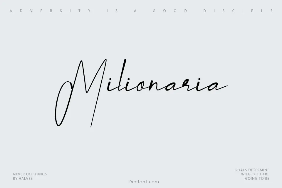 Milionaria is a sophisticated handwritten typeface characterized by flowing curves and graceful, organic letterforms that exude elegance and refinement. Created with meticulous attention to delicate strokes and natural handwriting aesthetics, this script font combines light weight with expressive character styling. The monotonic design ensures consistency while maintaining an organic feel, making it exceptionally versatile for contemporary design projects requiring polish and sophistication. Ideal applications include luxury branding, upscale packaging, editorial layouts, wedding stationery, formal business cards, and logo designs where an air of exclusivity and craftsmanship is desired.