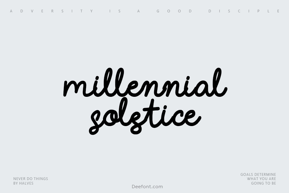 Millennial Solstice is a carefully handwritten cursive font designed for modern graphic design projects. This smooth and bold script typeface features excellent readability and elegant typography, making it perfect for creative applications including banners, headers, logos, branding, product packaging, and photographs. With its perfect blend of handcrafted style and contemporary appeal, this font brings sophisticated character to any design project.