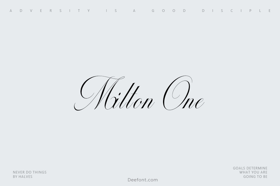 Milton One is an elegant calligraphy font designed with a modern hand-drawn feel, combining formal aesthetics with decorative appeal. Perfect for branding, posters, invitations, and creative typography, this script typeface features mixed case alphabets, numbers, and punctuation marks. Available in regular and bold styles, Milton One delivers eye-catching letterforms suitable for professional and artistic projects that demand distinctive, refined character.