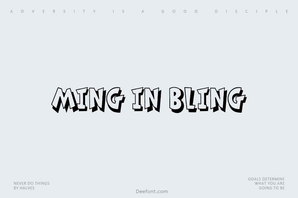 Ming in Bling is a bold, whimsical display font designed by JSH creates, featuring distinctive bling-like embellishments and dynamic letterforms. This cartoon-inspired typeface combines playful energy with intricate three-dimensional effects, creating eye-catching characters ideal for logos, headlines, posters, and promotional materials. With its compact structure and expressive personality, Ming in Bling brings charisma and vibrancy to creative branding projects, event graphics, and social media content.