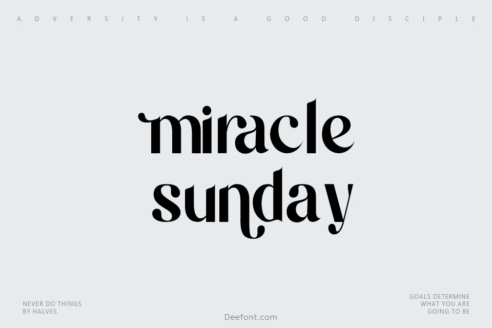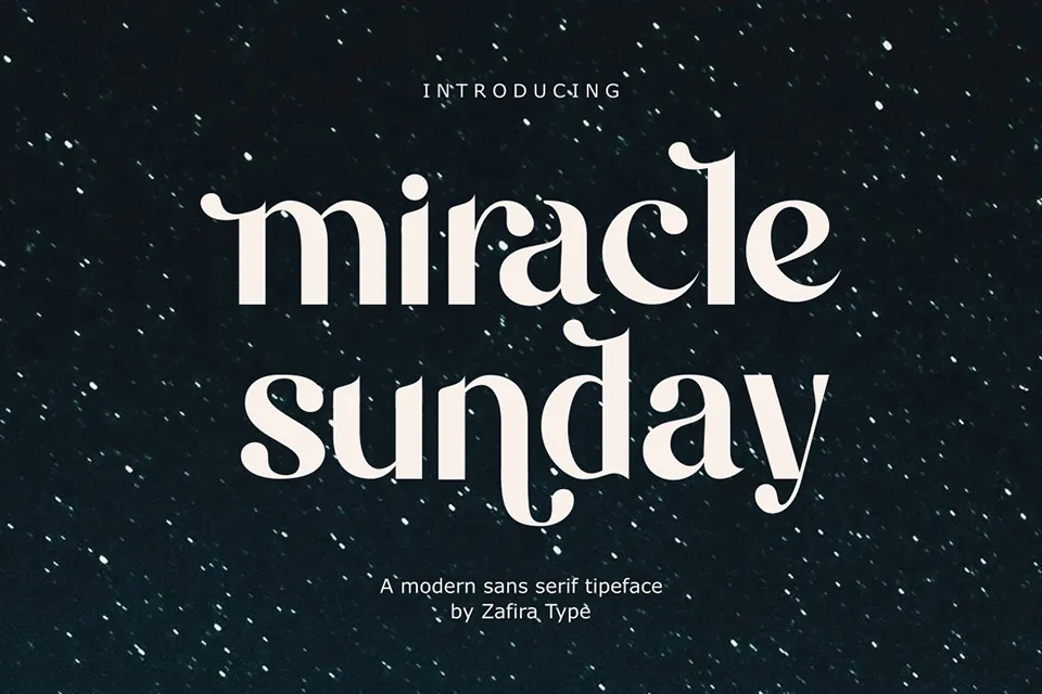 Miracle Sunday Font is a modern and elegant sans-serif display font, perfect for advertising, branding, logotypes, packaging, titles, and headlines. Its stylish and contemporary design makes it ideal for creative projects that require a sophisticated and eye-catching typeface.