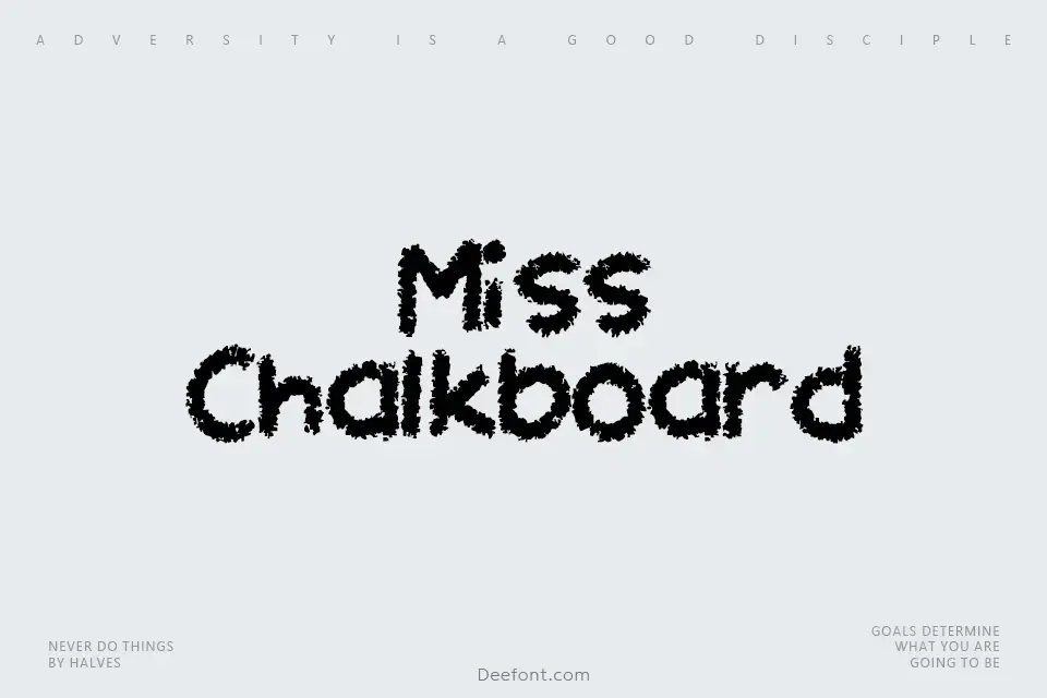 Unleash creativity with the Miss Chalkboard Font, a texture-rich design that captures the authentic feel of classroom nostalgia. Created by Darrell Flood, this handwritten script features rough edges and a dusty, chalk-like finish, making it ideal for educational posters, rustic café menus, and playful DIY crafts. Its casual, bouncy flow adds a personalized touch to any project requiring a school-days aesthetic.