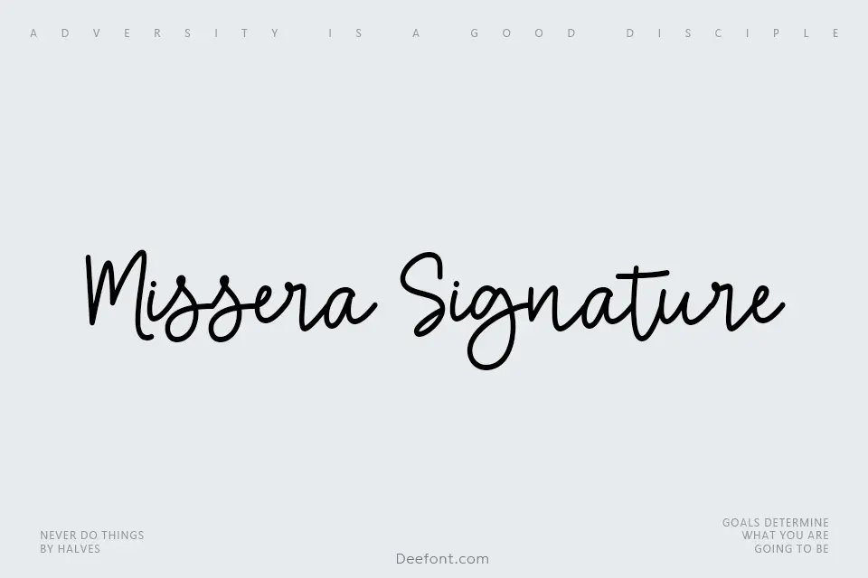 Missera Signature is an elegant handwritten script typeface that captures authentic pen-drawn character and warmth. With flowing, natural letterforms and distinctive stroke variations, this font excels in signature-inspired applications including wedding invitations, event programs, greeting cards, and personal branding projects. Its organic feel adds genuine personality to posters, packaging, and decorative headings, making it ideal for designers seeking fonts that communicate sophistication and artistic expression.