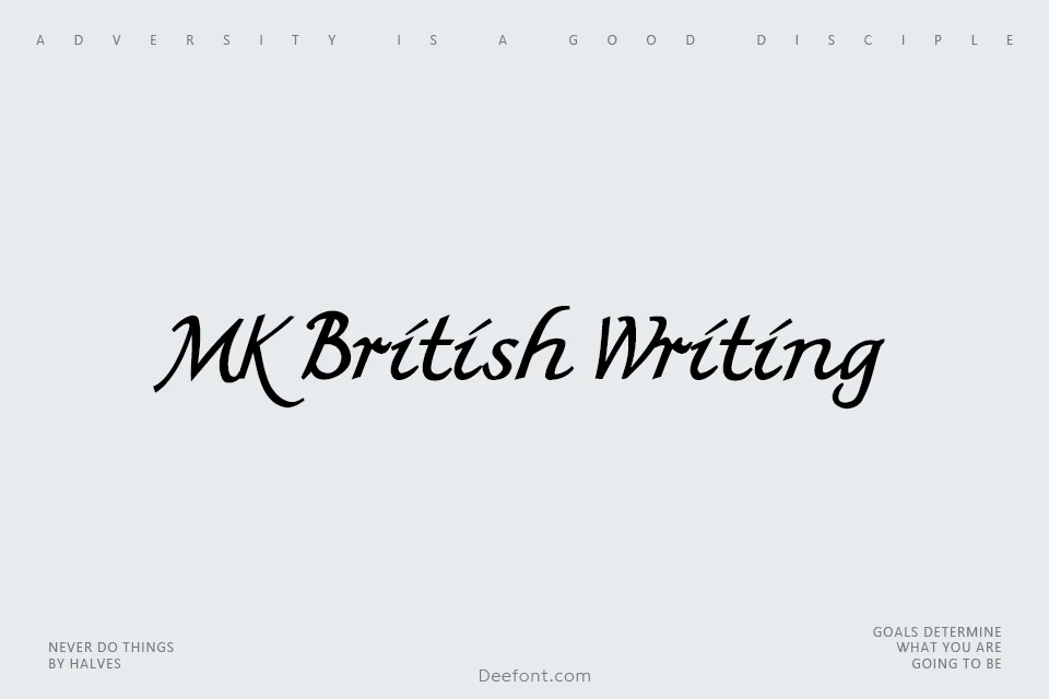 MK British Writing is an elegant script typeface that captures the essence of classic British handwriting. Designed with fluid, graceful letterforms and refined details, this free font brings sophistication and personality to any creative project. Perfect for invitations, greeting cards, branding, and typography-focused designs, MK British Writing delivers authentic handwritten charm with professional polish. Its versatile style adapts beautifully to both formal and creative applications, making it an ideal choice for designers seeking distinctive, readable script fonts with character and warmth.