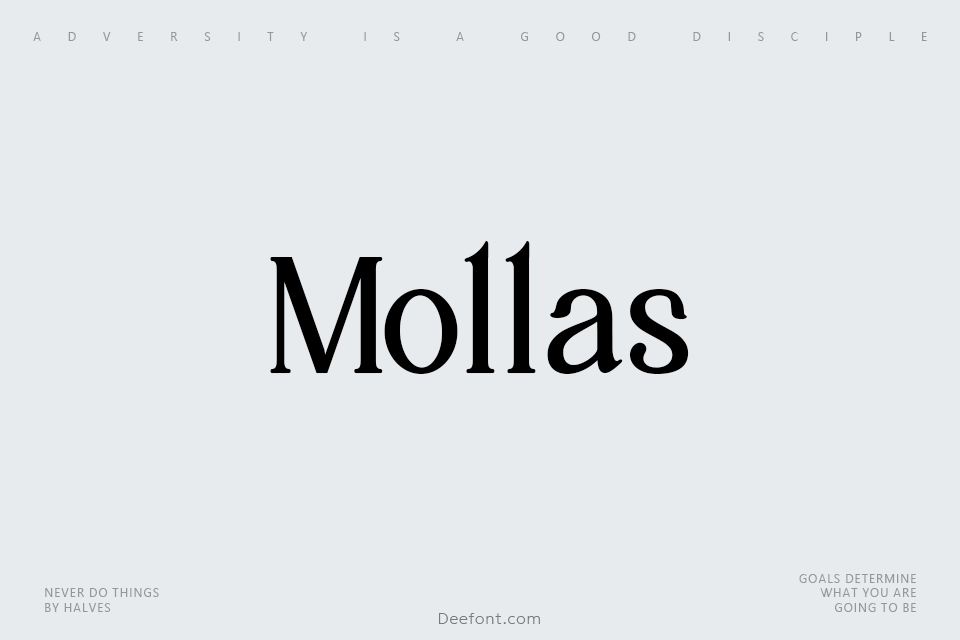 Mollas is an elegant and versatile serif typeface that delivers a playfully nostalgic aesthetic with a vintage charm. Featuring 14 font weights from Thin to Heavy, this formal and refined font excels in branding design, headers, logos, social media, and online presentations. With multilingual support and stylistic alternates, Mollas offers sophisticated typography solutions for professional creative projects and elegant editorial designs.