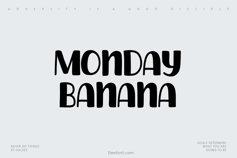 Monday Banana is a playful and bold display font featuring a whimsical, rounded style with a strong presence. The characters are thick and slightly irregular, giving them a hand-drawn, organic feel. With its unique character shapes and vibrant personality, this versatile font is perfect for children’s books, playful branding, posters, creative invitations, and any project requiring a fun and engaging visual impact. Its distinctive design makes it an ideal choice for headlines, logos, and decorative applications.