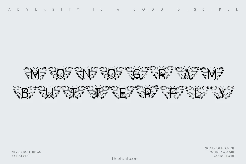 Monogram Butterfly is an elegant and decorative display font featuring lovely butterfly-inspired ornaments and monogram elements. This charming typeface is perfect for creating sophisticated wedding invitations, beautiful stationery, eye-catching social media graphics, and greeting cards. The font combines whimsy with elegance, offering distinctive design elements ideal for personal projects and creative endeavors seeking a touch of artistic flair and natural beauty.