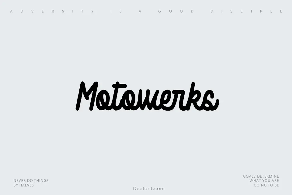 Motowerks is a dynamic vintage script font by Garisman Studio that embodies the gritty spirit of motorcycle culture. Featuring a fluid monoline structure and retro flair, this handwritten typeface excels in automotive branding, badge designs, and apparel. Its nostalgic, old-school aesthetic makes it a perfect choice for bold logos, posters, and creative projects requiring a rugged, handmade touch.