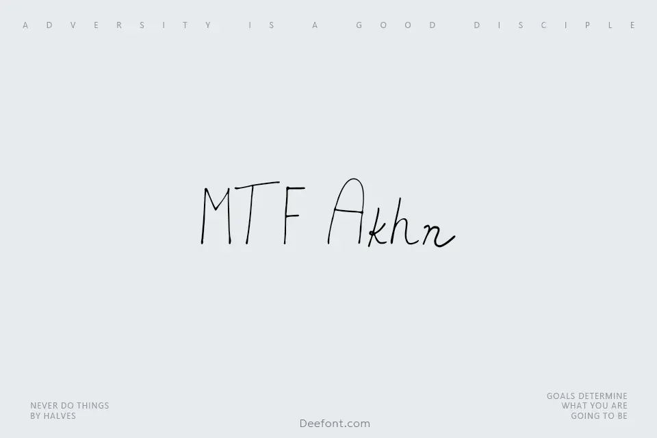 MTF Akhn is a delightful handwritten script typeface that captures the warmth of hand-drawn lettering with gentle, flowing strokes and organic character forms. Created with FontCreator 6.0, this friendly font features approachable, casual letterforms perfect for posters, greeting cards, invitations, and decorative display purposes. Its soft curves and informal aesthetic make it an excellent choice for projects seeking a personal, approachable touch without sacrificing readability. Ideal for creative professionals and enthusiasts designing festive layouts, social media graphics, and handcrafted branding elements.
