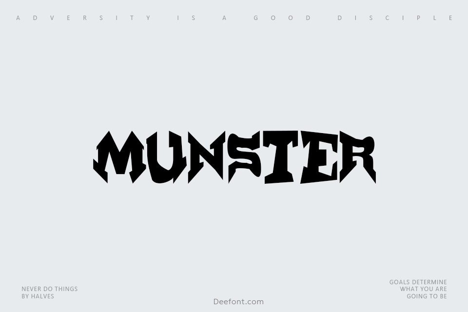 Munster is a bold, gothic-inspired display font characterized by dramatic pointed serifs, thick strokes, and sharp angular edges. Created by Catalan designer LletresCAT, this decorative typeface delivers striking visual impact through its medieval and gothic aesthetic. With its 68 glyphs, the font maintains consistent styling across uppercase, lowercase letters, numbers, and special characters. Perfect for horror-themed posters, Halloween invitations, video game titles, and projects demanding attention-grabbing headlines, Munster combines distorted letterforms with high contrast to create memorable designs suitable for thematic and creative applications.