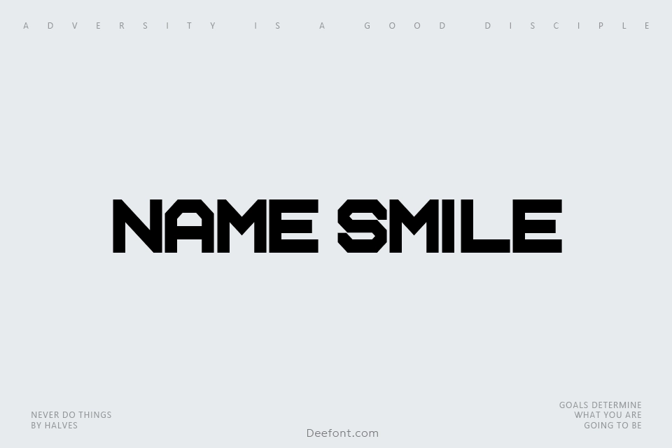 Name Smile is a bold, geometric techno-square typeface with a modern and industrial aesthetic. Featuring thick, straight lines and sharp corners throughout its angular character construction, this display font conveys a lively, futuristic feel ideal for contemporary design projects. With 98 carefully crafted characters including uppercase letters, numbers, and punctuation symbols, Name Smile excels in delivering strong visual impact for branding, posters, headlines, and signage applications across digital and print media.