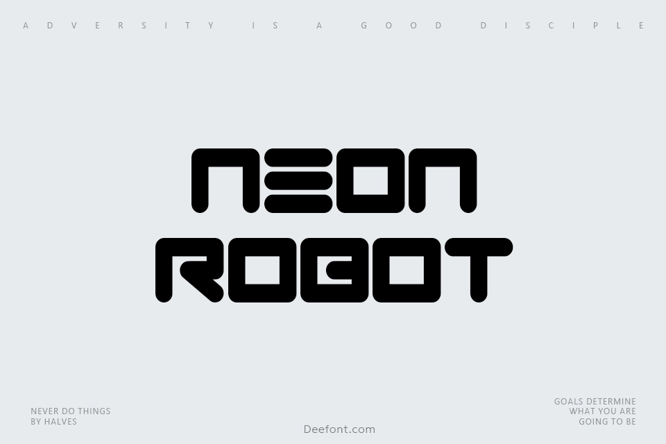 Neon Robot is a bold, futuristic display font designed with rounded geometric letterforms and consistent thickness. Created by Darrell Flood, this tech-inspired typeface features uppercase and lowercase letters with 182 glyphs, making it ideal for digital interfaces, sci-fi projects, video game titles, and technology branding. The uniform character construction provides a modern robotic aesthetic perfect for contemporary design applications.