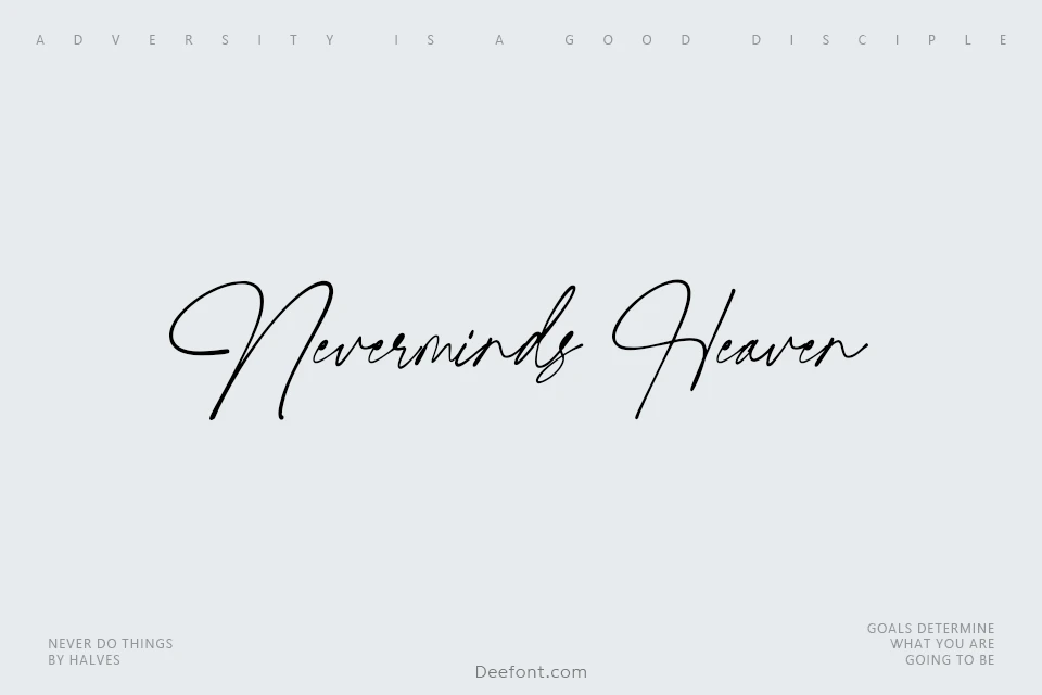 Neverminds Heaven Font is an exquisite handwritten typeface, masterfully designed to become a true favorite. Its natural signature style is perfect for product packaging, branding projects, magazines, social media, weddings, or simply to express words with elegance and personality.