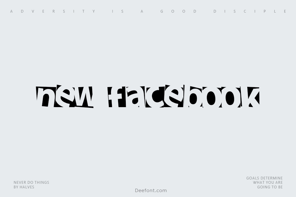 New Facebook is a distinctive distorted and decorative font featuring chaotic and defective letterforms that create a modern, eye-catching aesthetic. This full lowercase typeface includes all numerals and essential punctuation marks, making it ideal for mastheads, social media posts, logotypes, advertisements, and creative display projects. With its atypical vibe and distorted character design, New Facebook brings a unique and memorable presence to any design work requiring an unconventional typographic approach.