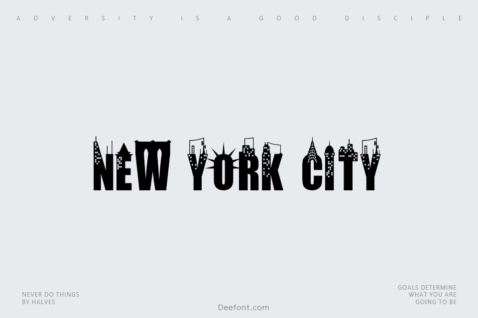 The New York City font is a bold and decorative typeface that captures the iconic essence of New York’s urban landscape. Each character features distinctive skyline silhouettes with architectural details including windows and antennas, creating a visually striking metropolitan aesthetic. With its high-impact blocky style, this display font is perfect for headlines, posters, travel brochures, and city-themed projects that demand strong visual presence and urban sophistication.