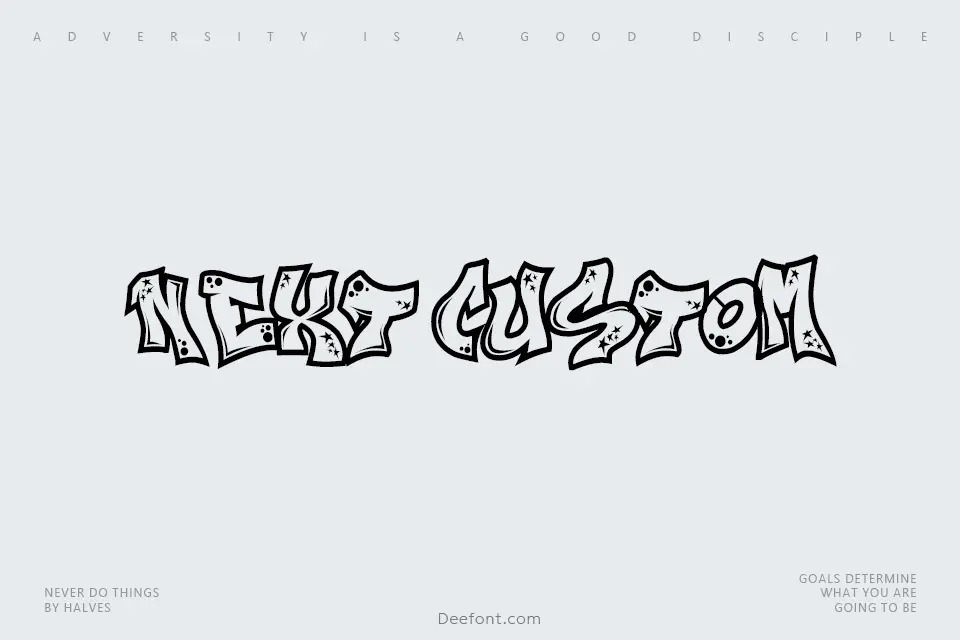 Next Custom is a bold, graffiti-inspired script font featuring dynamic curves and star-like embellishments that create a distinctive urban aesthetic. With its playful and rebellious edge, this font showcases 42 unique characters adorned with decorative elements, maintaining consistent thickness for excellent readability while embracing artistic flair. The energetic design makes it perfect for eye-catching headlines, street art designs, music album covers, and edgy branding projects that demand a powerful visual statement with contemporary urban vibes.
