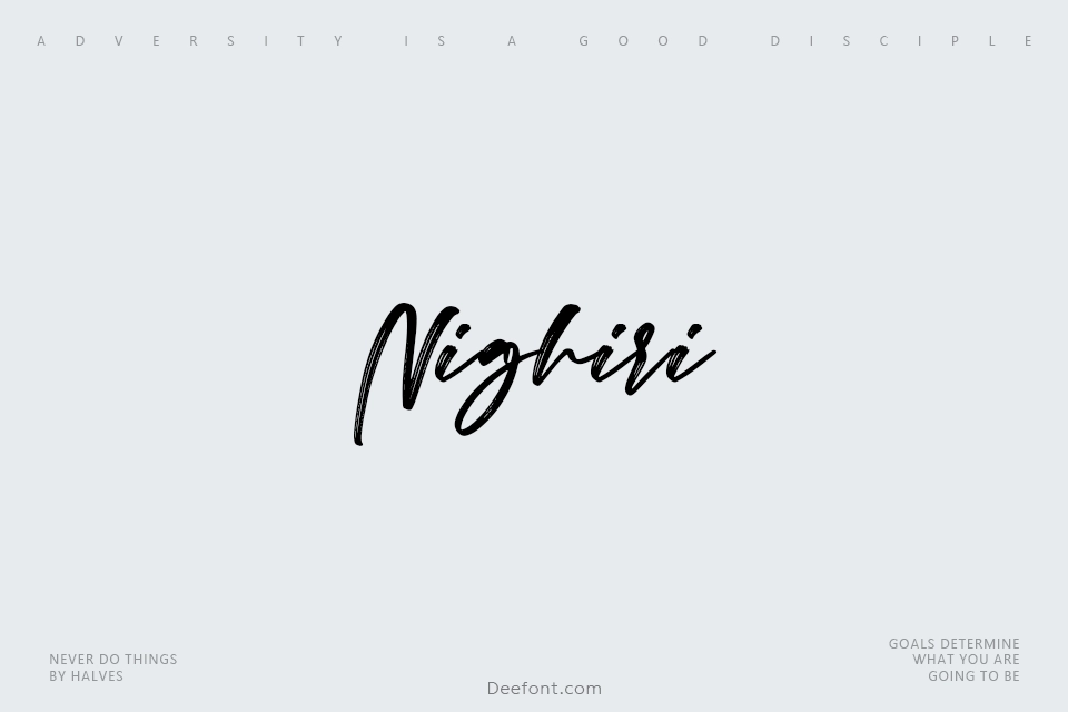 Nighiri is an elegant handbrush script font designed for multipurpose creative projects. This stunning brush script typeface features beautiful, flowing characters with natural fast-drying stroke effects, making it perfect for logos, signatures, branding, product packaging, social media graphics, and handwritten quotes. With comprehensive character support including uppercase and lowercase letters, numerals, and punctuation marks across multiple languages, Nighiri delivers sophisticated elegance for display typography and signature-style designs.