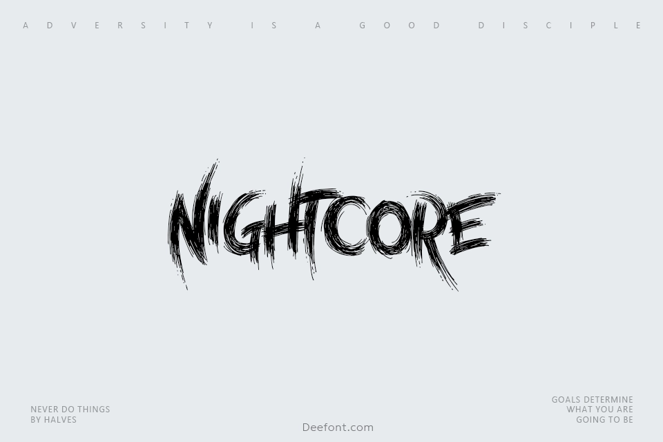 Nightcore is an edgy, modern display typeface inspired by the emo scene and horror films of the 2000s. Featuring aggressive brush strokes and sharp angular lines reminiscent of urban aesthetics, this font brings screamo vibrancy to eye-catching titles, branding materials, and social media graphics. With special emo-gothic characters that recreate Myspace profile aesthetics, Nightcore effortlessly blends retro 2000s emotional energy with contemporary design trends. The typeface includes capitals, uppercase alternates, numerals, punctuation marks, and distinctive special characters, offering versatility for creative designers seeking bold, statement-making typography that stands out from the crowd.