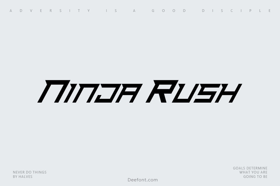 Ninja Rush is a dynamic and angular futuristic display font featuring sharp edges and a forward-leaning stance that conveys speed and motion. Created with precise geometric uppercase letters and consistent lowercase styling, this typeface delivers a sleek, aggressive aesthetic perfect for tech branding, video game titles, sports logos, and action-oriented designs that demand urgency and modern technological appeal.