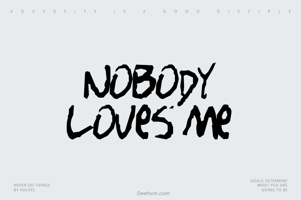 Nobody Loves Me is a bold, expressive handwritten font with a rough, textured style characterized by irregular and dynamic strokes. This script typeface features a distinctive artistic flair with an authentic, raw appearance perfect for artistic projects, album covers, and creative posters. The font maintains consistent styling across uppercase and lowercase letters, numbers, and special characters, making it ideal for designs requiring individuality and personality.