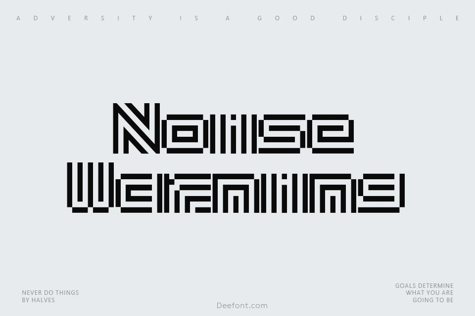 Noise Warning Font is a futuristic display typeface designed with a unique modular aesthetic. It features a 9×9 grid structure, incorporating arcs and slashes as key design elements. The font includes 475 characters, covering English letters, Roman letters, Japanese kana, and common punctuation marks. It is particularly suited for designs requiring a technological or futuristic feel. The font’s versatility makes it ideal for use alongside other science and technology-themed typefaces. Its modern design elements enhance visual impact, making it a great choice for projects needing a bold, futuristic look.