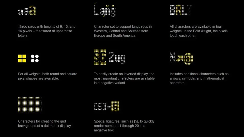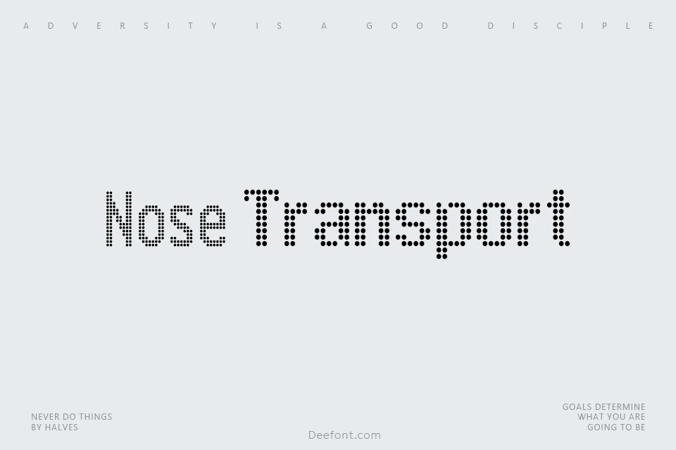 Nose Transport Font Family is a specialized display typeface inspired by dot matrix screens commonly used in Swiss public transportation systems, such as trains, trams, and buses. Designed by Nose AG, this font family combines functionality with clarity, offering three font sizes, four weight classes (Fine, Light, Regular, and Bold), and two pixel shapes (round and square). Its precise and legible design makes it ideal for visualizations on matrix displays, ensuring readability even in challenging environments. Freely available under the SIL Open Font License, Nose Transport is a versatile choice for public information systems and creative projects requiring a technological aesthetic.