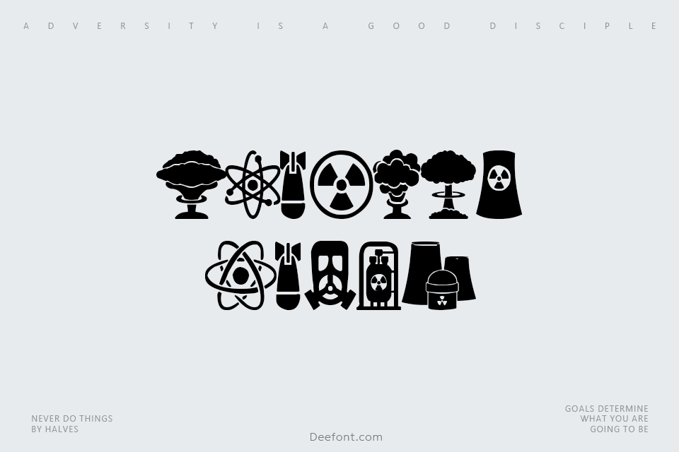 Nuclear Icons is a bold, high-contrast dingbat typeface featuring iconic imagery related to nuclear power and hazard-themed pictograms. The font comprises striking symbols including radioactive signs, gas masks, power plants, atomic symbols, bombs, mushroom clouds, and warning icons rendered as solid black silhouettes with clear, simple shapes. Designed with maximum recognizability and impact in mind, this decorative display font is ideal for posters, infographics, safety manuals, warning signs, and themed graphic design projects seeking industrial and modern aesthetic appeal.