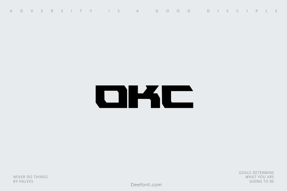 OKC is a geometric display font with bold futuristic square letterforms and cubic edges. This modern techno typeface delivers striking sci-fi aesthetics for headlines and logos. Uppercase-only characters create strong visual impact for contemporary design projects requiring distinctive technological styling.