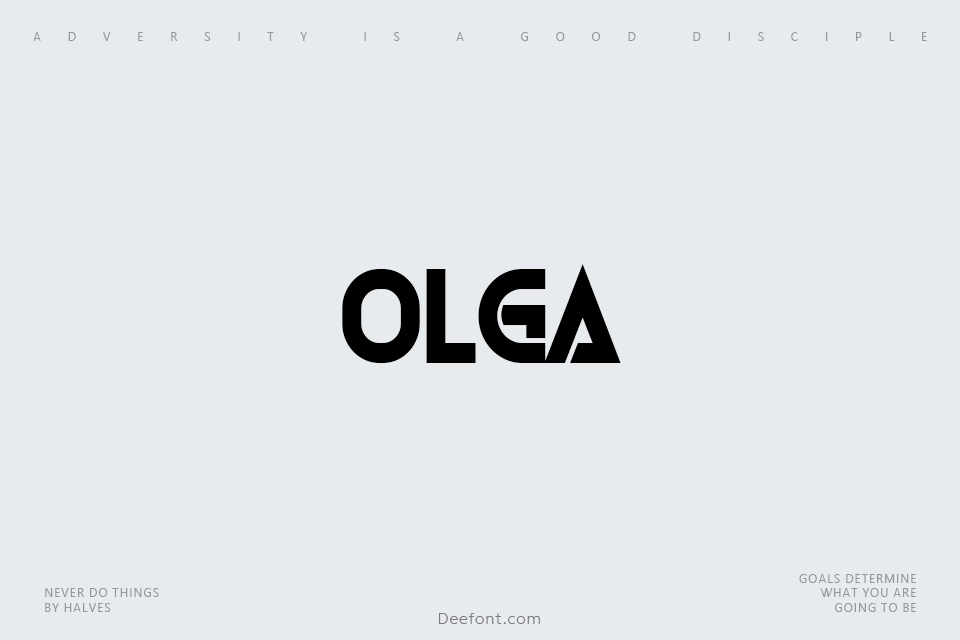 Olga is a bold, geometric sans-serif font with modern and futuristic design characteristics. Crafted by Vladimir Nikolic, this typeface features strong angular lines, sharp edges, and a distinct blocky appearance. The font excels in headlines, branding, and display applications where a contemporary visual impact is required. Available in eight weights including light, regular, bold, and black variants with corresponding italic versions, making it a versatile choice for various creative projects and digital media compositions.