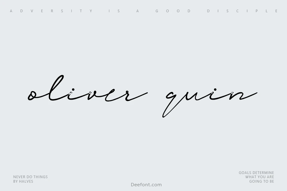 Oliver Quin Font is an elegant, sweet, and simple script font with a firm character and unique flow. Designed with detailed penmanship, it brings a stylish, free-flowing touch to any project, making it ideal for logos, print media, social media graphics, and more. Its harmonious balance and handcrafted feel add a personal, sophisticated flair to your creative work.