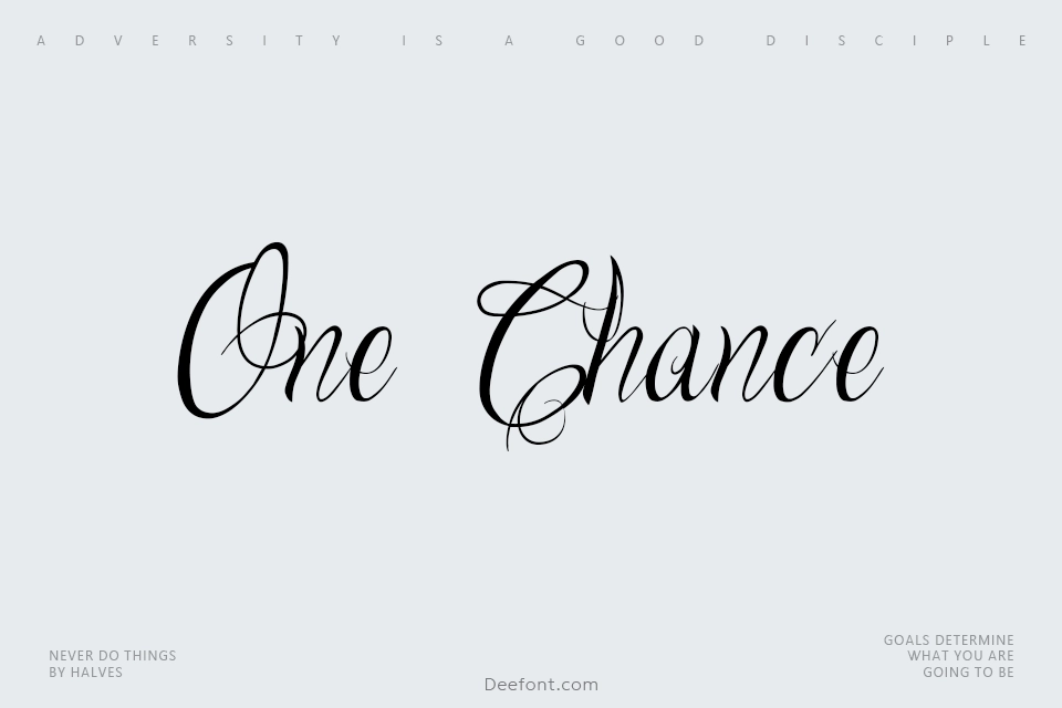 One Chance Script is an elegant calligraphic typeface designed for personal creative projects. With its fluid, hand-drawn aesthetic, this script font delivers sophisticated typography perfect for invitations, greeting cards, and decorative applications. The font features graceful letterforms and smooth curves that evoke a refined, artistic sensibility ideal for anyone seeking charming, expressive text designs.