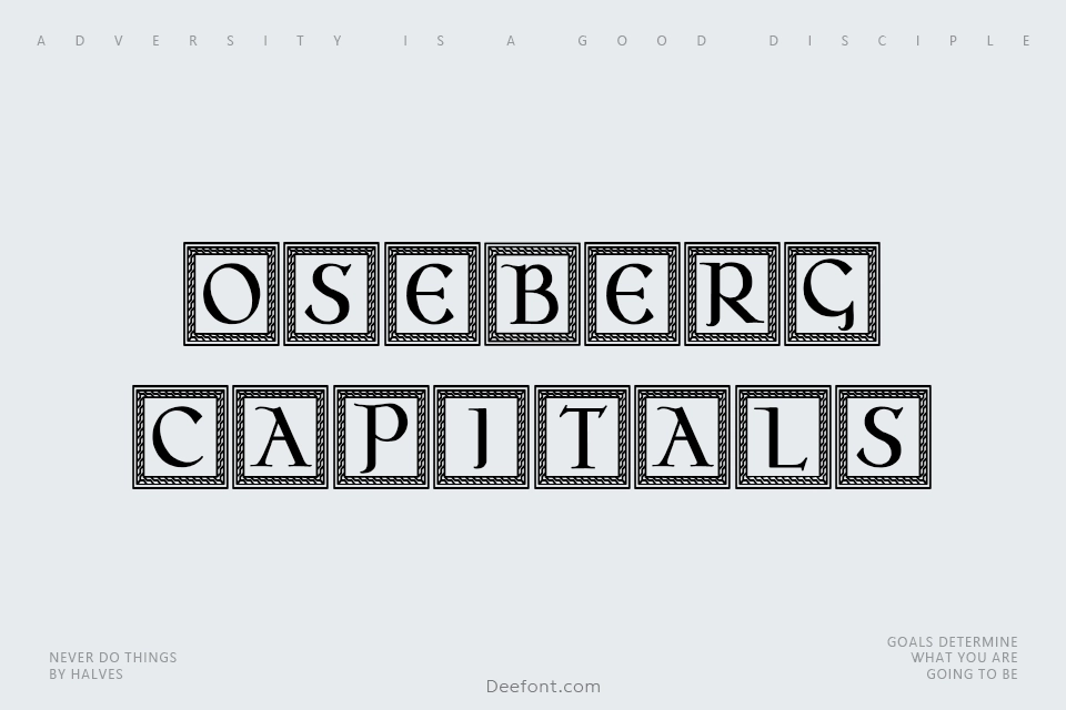 Oseberg Capitals is a captivating Gothic font designed by Vladimir Nikolic, blending the essence of Celtic initials with ornate medieval aesthetics. This decorative typeface features intricate, bold letterforms adorned with elaborate border designs around each character. Ideal for fantasy-themed designs, book covers, album artwork, and historical projects, Oseberg Capitals evokes ancient mystique and enchantment. With its distinctive combination of gothic elegance and intricate ornamentation, this font transports your typography to a realm of timeless charm and otherworldly allure.