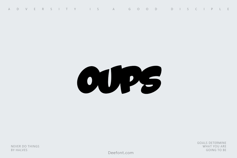 Oups is a playful and whimsical display font that combines cartoon and comic elements to create a charming, lighthearted typography. With its rounded, organic letterforms and bouncy character, this font brings creativity and personality to any design project. Perfect for playful branding, creative posters, invitation designs, and casual digital content, Oups offers a unique blend of contemporary flair and comic charm that stands out on screen and in print.