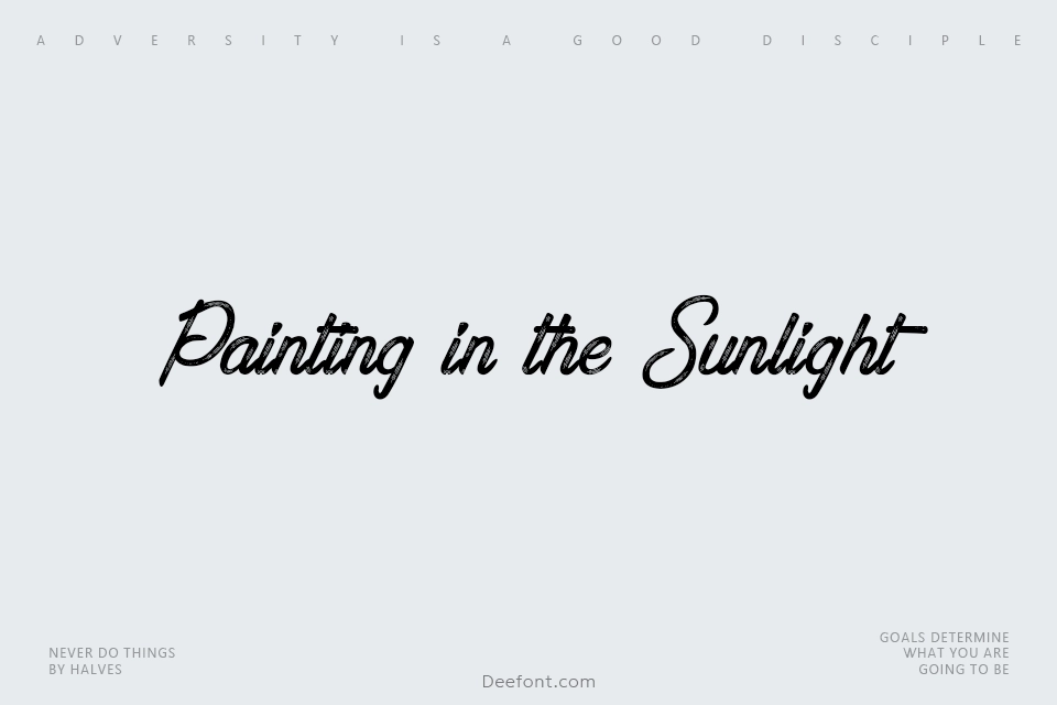 Painting in the Sunlight is a dynamic and flowing script font characterized by elegant, cursive letterforms with bold, slightly slanted uppercase letters that convey movement and grace. The lowercase letters maintain smooth connections between characters, enhancing readability while preserving a handwritten aesthetic. With 203 glyphs supporting 37 languages, this decorative script font is ideal for wedding invitations, greeting cards, personal branding, and artistic projects requiring a personal, sophisticated touch. Its playful yet refined appearance makes it perfect for creative endeavors seeking distinctive, elegant typography.