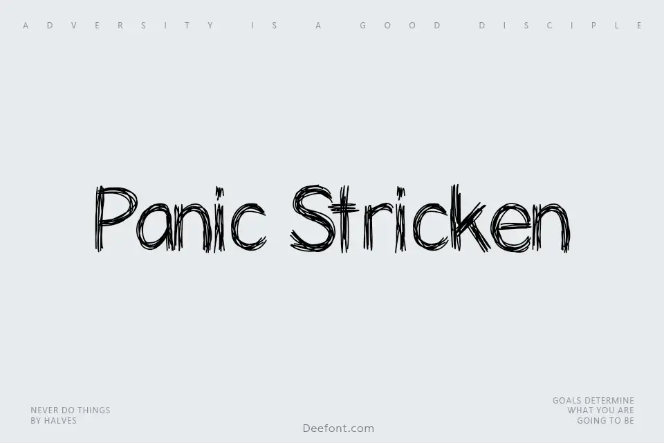 Panic Stricken is a jagged handwritten horror font with scratchy strokes, uneven baselines, and distressed edges that instantly create tension. Its chaotic, inked letterforms feel like they were carved in a rush, making it perfect for Halloween posters, scary movie titles, haunted house flyers, dark game logos, and thriller book covers. Use this dramatic display script for bold headlines, eerie packaging, and any design that needs an urgent, panic-filled atmosphere.