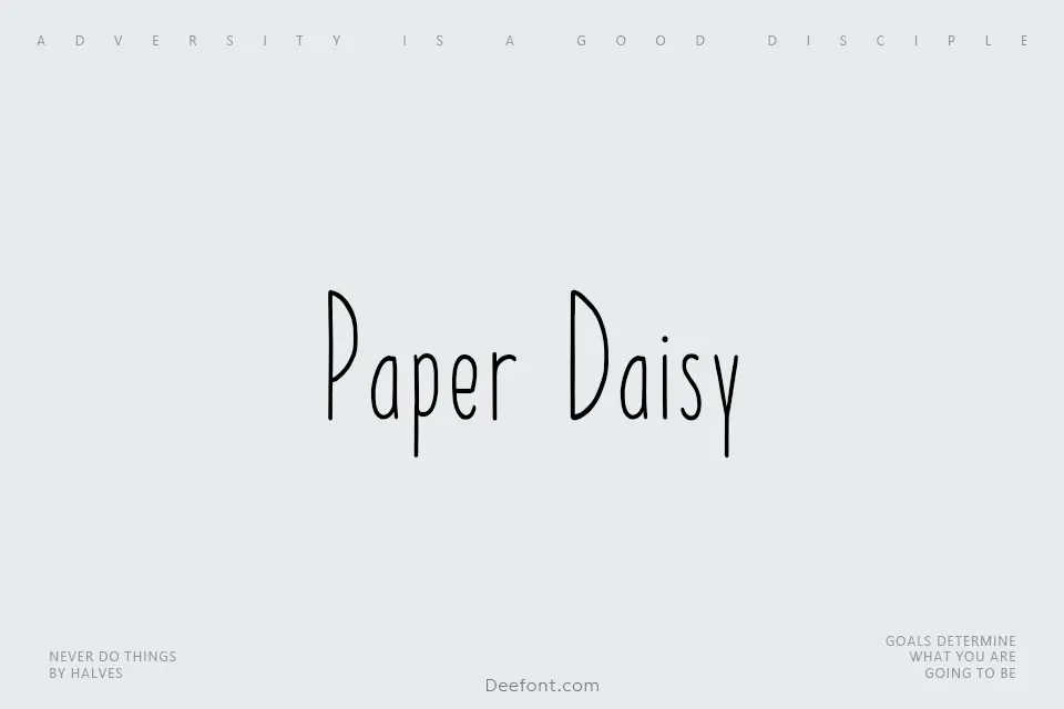 Paper Daisy is a delightful handwritten font characterized by its light, condensed strokes and charming, organic quality. This whimsical font features fluid, lively letterforms that evoke a sense of handcrafted authenticity, making it ideal for creative applications including whimsical stationery, personalized invitations, rustic branding, product packaging, and decorative posters. The font’s tall, narrow letters with playful style deliver a clean, cohesive visual impact across diverse design layouts while conveying a warm, artisanal aesthetic perfect for projects requiring personalized elegance and handmade charm.