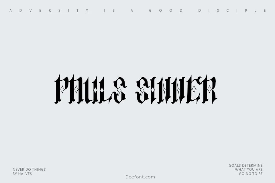Pauls Sinner is a bold and striking Gothic typeface that combines modern design elements with traditional blackletter influences. This versatile display font features dramatic letterforms perfect for tattoo designs, album artwork, graffiti-inspired projects, and eye-catching headlines. Created by artist Paul, formerly known as Tattoo Paul, this font delivers edgy character and distinctive visual impact for designers seeking bold, unconventional typography solutions.
