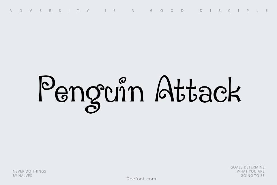Penguin Attack is a whimsical and versatile curly display font perfect for creative typography projects. Created by Cheapskate Fonts and released in 2003, this playful typeface features flowing curves and decorative flourishes that bring personality and charm to any design. With its bouncy, characteristic style and extensive character support, the font is ideal for posters, invitations, and casual branding applications. The font contains 201 glyphs and supports multiple languages, making it accessible for diverse creative endeavors.