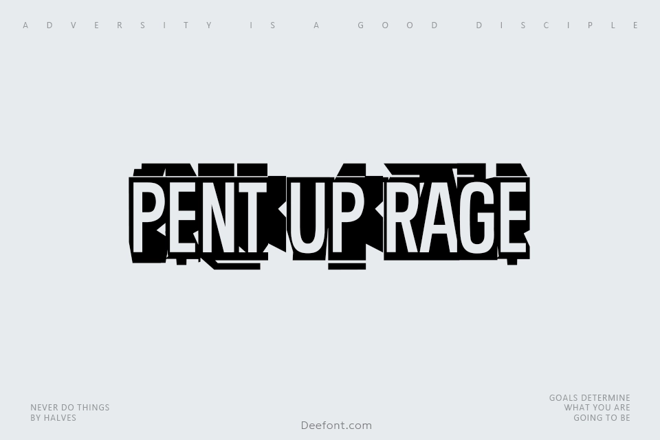 Pent-Up Rage is a bold, distinctive display font designed with an expressive and aggressive aesthetic. Created by Finnish type designer Juha Korhonen, this typeface combines sharp, angular letterforms with a grunge-inspired sensibility, making it ideal for eye-catching headlines, poster designs, and contemporary visual projects. The font features 1,167 glyphs and delivers powerful visual impact through its unique character design.