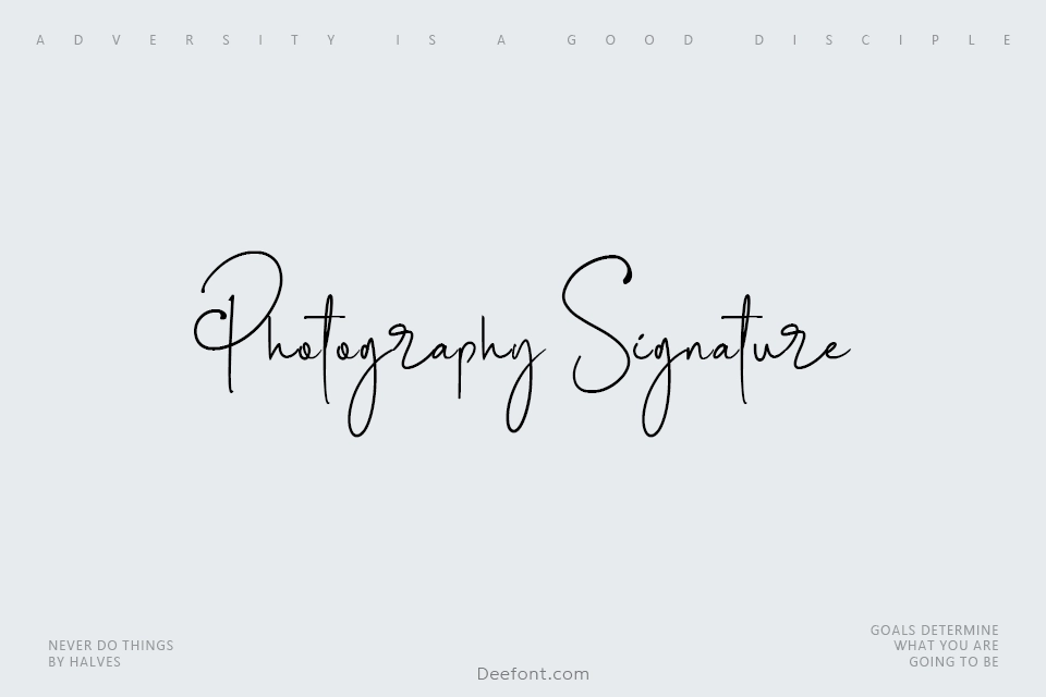 Photography Signature is a sophisticated script font featuring handmade signature styling with decorative characters and a dancing baseline. Designed specifically for photography professionals and creative projects, this elegant typeface delivers a personal touch to logos, watermarks, invitations, and branding materials. With its refined letterforms and authentic pen-written aesthetic, it brings a distinctive charm and professionalism to any design endeavor requiring an authentic signature appearance.