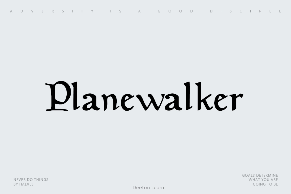 Planewalker is a captivating calligraphic-style font based on the card text from the early editions of Magic: The Gathering. This gothic typeface features elegant flourishes, extended punctuation, and Euro support, making it ideal for fantasy-inspired designs, branding, and editorial layouts. Available in regular, bold, italic, and bold-italic weights with comprehensive character coverage.