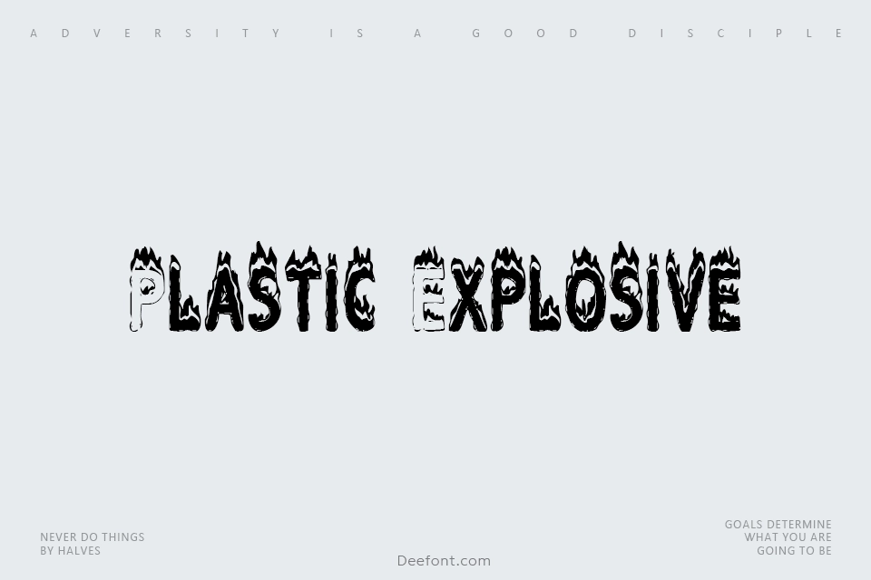 Plastic Explosive is a bold, decorative display font featuring distinctive flame-like extensions on uppercase letters, creating a dynamic and intense visual style. Designed by Blonde Fonts, this fiery typeface is characterized by thick, robust strokes that deliver strong visual impact. The font operates in all-caps format with two variations—empty and filled—making it ideal for attention-grabbing headlines, movie posters, video game titles, and event flyers that demand dramatic energy and powerful presence.