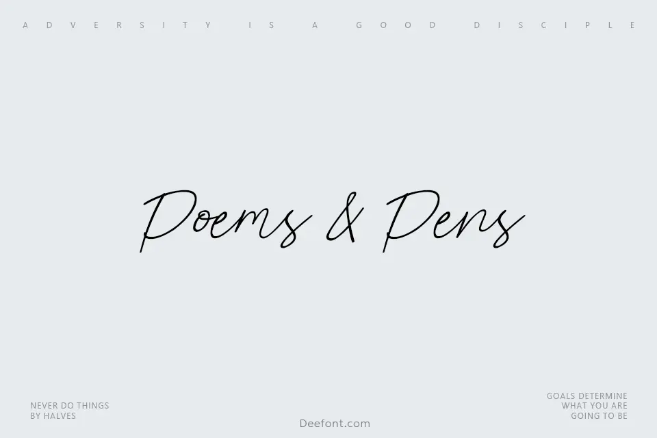 Poems & Pens is a beautifully flowing handwritten script typeface featuring graceful, organic letterforms with authentic pen-drawn characteristics. The font captures the elegance of traditional calligraphy and penmanship, offering dramatic stroke variations and elegant curves that evoke intimate, artistic expression. With its sophisticated yet approachable aesthetic, this typeface excels in display applications including posters, invitations, greeting cards, book covers, and branding projects. The bold italic variant provides dynamic visual impact for headlines and decorative titles while maintaining legibility in larger sizes, making it an excellent choice for artistic projects, wedding stationery, and premium packaging design.