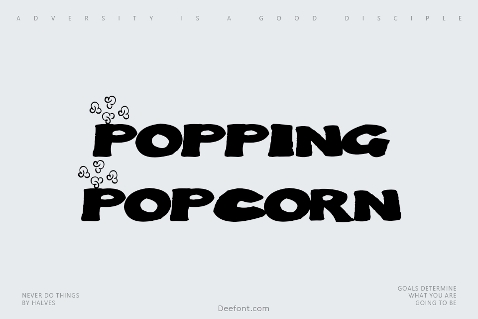 Popping Popcorn is a playful and bold display font featuring a unique design where each character is topped with a whimsical popcorn motif, adding a fun and lively touch. The letters are thick and rounded, giving them a friendly and approachable appearance. With 226 carefully crafted characters, this highly decorative typeface is perfect for projects requiring humor and creativity, from children’s book covers to party invitations and movie night posters. Its boldness ensures strong visual presence while the playful popcorn detail adds distinctive character interest and charm.