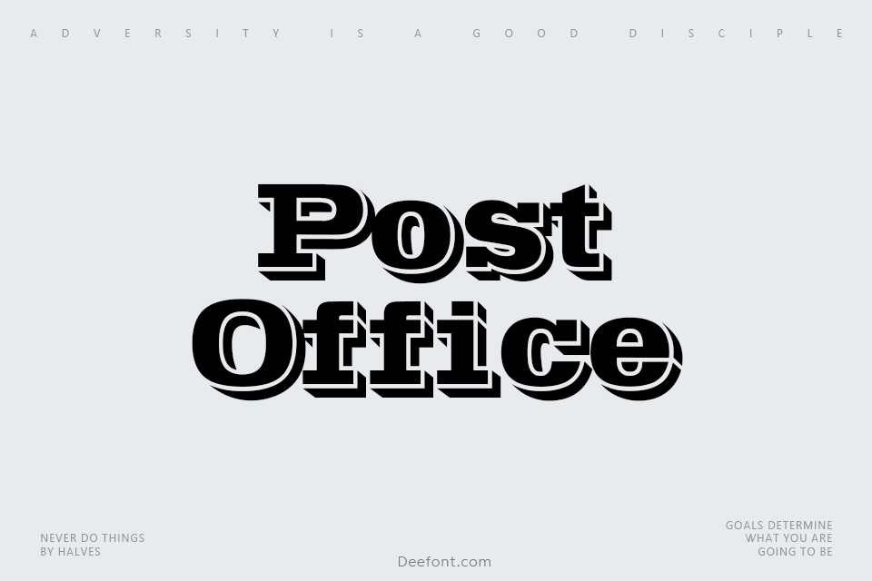Post Office is a bold and impactful display font featuring a distinctive slab serif style with shadow effects that add depth and dimension to each character. Combining classic serif aesthetics with a modern twist, this typeface maintains consistent weight across uppercase and lowercase letters, numerals, and special characters. With its striking visual presence and strong, eye-catching design, Post Office is ideal for headlines, posters, branding projects, logos, and any creative work requiring powerful typography that commands attention and delivers maximum impact.
