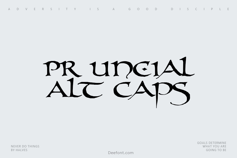 PR Uncial Alt Caps is a distinctive Gothic and Celtic-inspired display font featuring alternated capital letterforms rooted in medieval uncial scripts. Designed with artistic flair, this typeface combines historical calligraphic elements with modern design sensibilities, making it ideal for titles, headers, and creative projects that require an elegant, distinctive aesthetic with historical character and unique visual appeal.