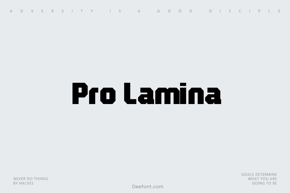 Pro Lamina is a distinctive techno and square typeface designed with geometric precision and modern aesthetic appeal. This bold, heavy octagonal font delivers a contemporary visual impact perfect for technology-focused designs, digital interfaces, and avant-garde typography projects. With its structured square forms and clean lines, Pro Lamina excels at commanding attention in both display and headline applications, making it an excellent choice for innovative branding, futuristic posters, and cutting-edge visual communications.