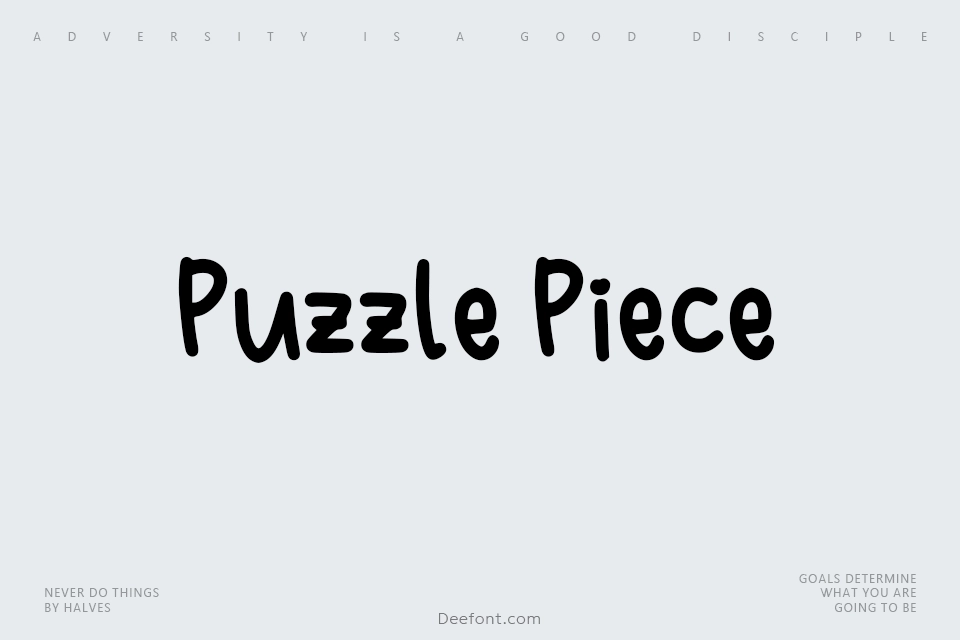 Puzzle Piece is a playful, hand-drawn script font featuring rounded letters and gently uneven strokes that evoke a charming, childlike quality. Created with Calligraphr, this handwriting-inspired typeface combines legibility with an informal, friendly aesthetic, making it ideal for headings, titles, and creative designs that demand an approachable, whimsical touch without sacrificing readability.