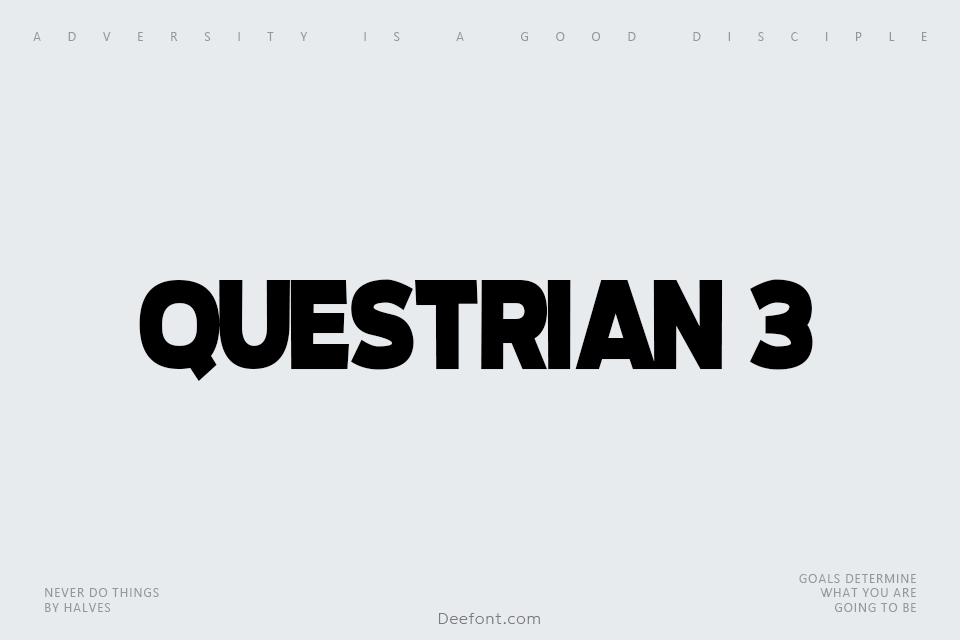 Questrian 3 is a modern sans serif font that brings contemporary elegance to your creative projects. Designed with clean lines and versatile letterforms, this typeface delivers strong visual impact perfect for display purposes, branding, and creative endeavors. The font combines geometric precision with playful character, making it an excellent choice for designs that demand both professionalism and personality. Whether you’re crafting posters, headlines, or logo concepts, Questrian 3 offers exceptional versatility for contemporary design work.